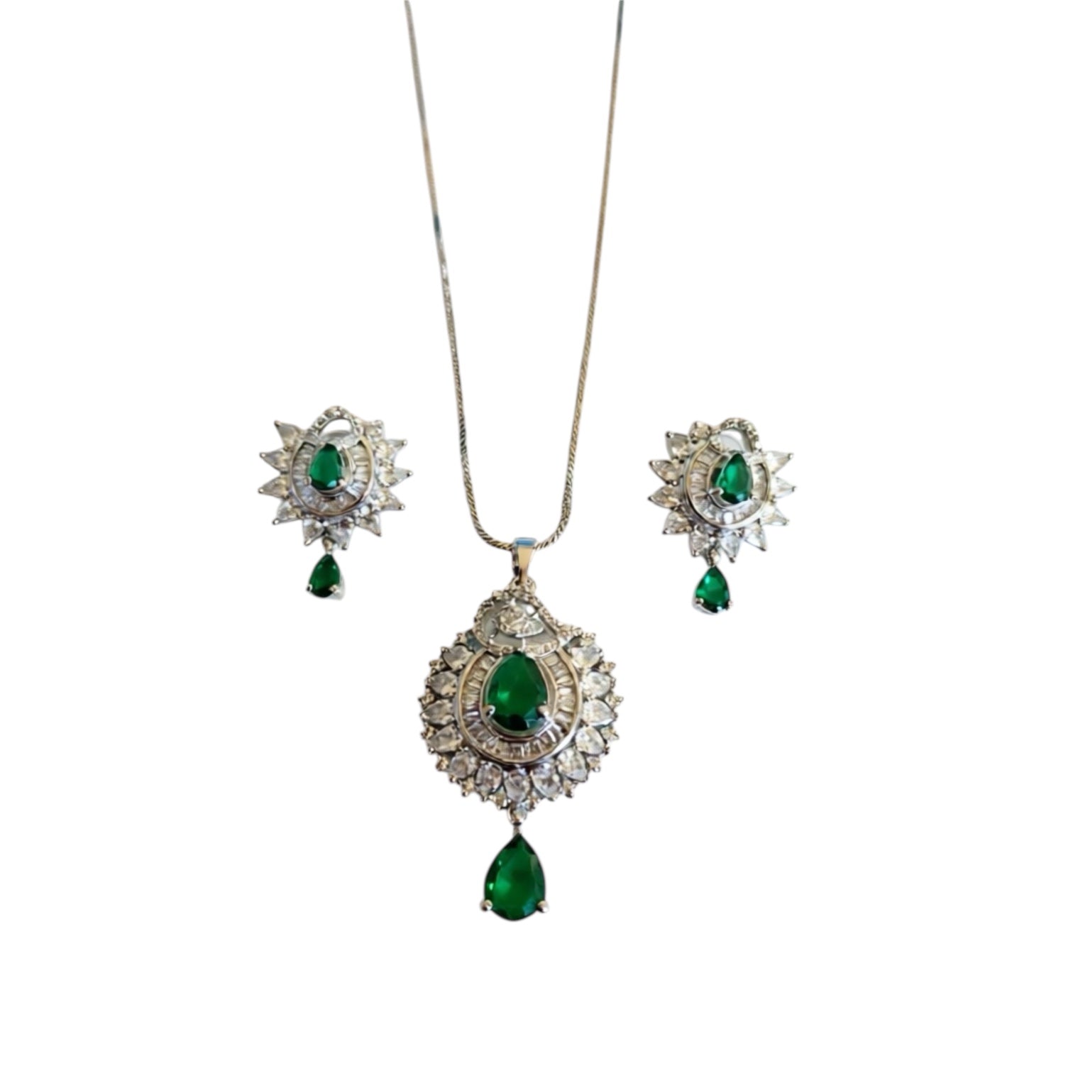 94209-PS-American Diamond Delicate Pendant Set With Rhodium Plating-Green